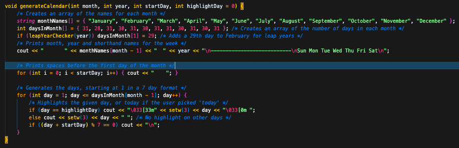 Once I was able to display the correct number of days per month, I was able to shift my focus to generating the actual calendar based on whether the user wanted today's date or whether they wanted to choose their own.