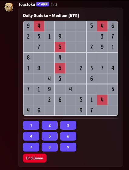 Toastoku offers the familiar Sudoku experience but with a twist, offering a variety of different themes and difficulties to choose from. The idea for the Discord Bot originally came from another Sudoku application that had awful playability especially within the multiplayer modes,